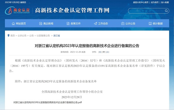 2023年12月28日,全國高新技術企業(yè)認定管理工作領導小組辦公室發(fā)布《對浙江省認定機構2023年認定報備的高新技術企業(yè)進行備案的公告》,中國能源工程集團有限公司(以下簡稱“中國能源工程集團”)所屬中清能源(杭州) 有限公司...
